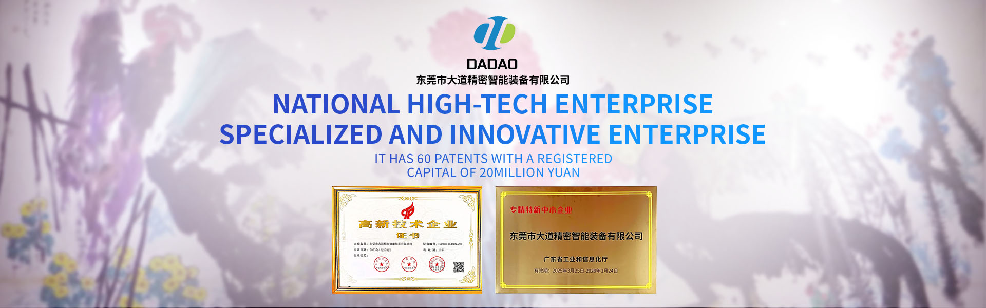 大道精密成立于2019年,公司注冊(cè)資本1000萬元,擁有辦公室、廠房等18,000多平方米。已通過ISO9001:2015國際質(zhì)量管理體系認(rèn)證,擁有國家各類專利共計(jì)58項(xiàng),獲得“中國大道.商標(biāo)”和“一帶一路十周年 .國禮品牌”等榮譽(yù)稱號(hào),屬于國家高新技術(shù)企業(yè),專精特新中小企業(yè)。2023年4月成立了“東莞市大道精密智能裝備有限公司關(guān)心下一代工作委員會(huì)”,是東莞市企石鎮(zhèn)工商聯(lián)副會(huì)長單位、東莞市企石鎮(zhèn)文學(xué)藝術(shù)界聯(lián)合會(huì)副主席單位、東莞市環(huán)保包裝行業(yè)協(xié)會(huì)副會(huì)長單位、東莞市數(shù)控裝備行業(yè)協(xié)會(huì)第二屆會(huì)長單位、廣東省包裝技術(shù)協(xié)會(huì)常務(wù)理事單位、廣東省膠粘劑行業(yè)協(xié)會(huì)理事單位、國家標(biāo)準(zhǔn)《機(jī)械安全中安全防護(hù)授權(quán)系統(tǒng)的基本要求》起草單位。